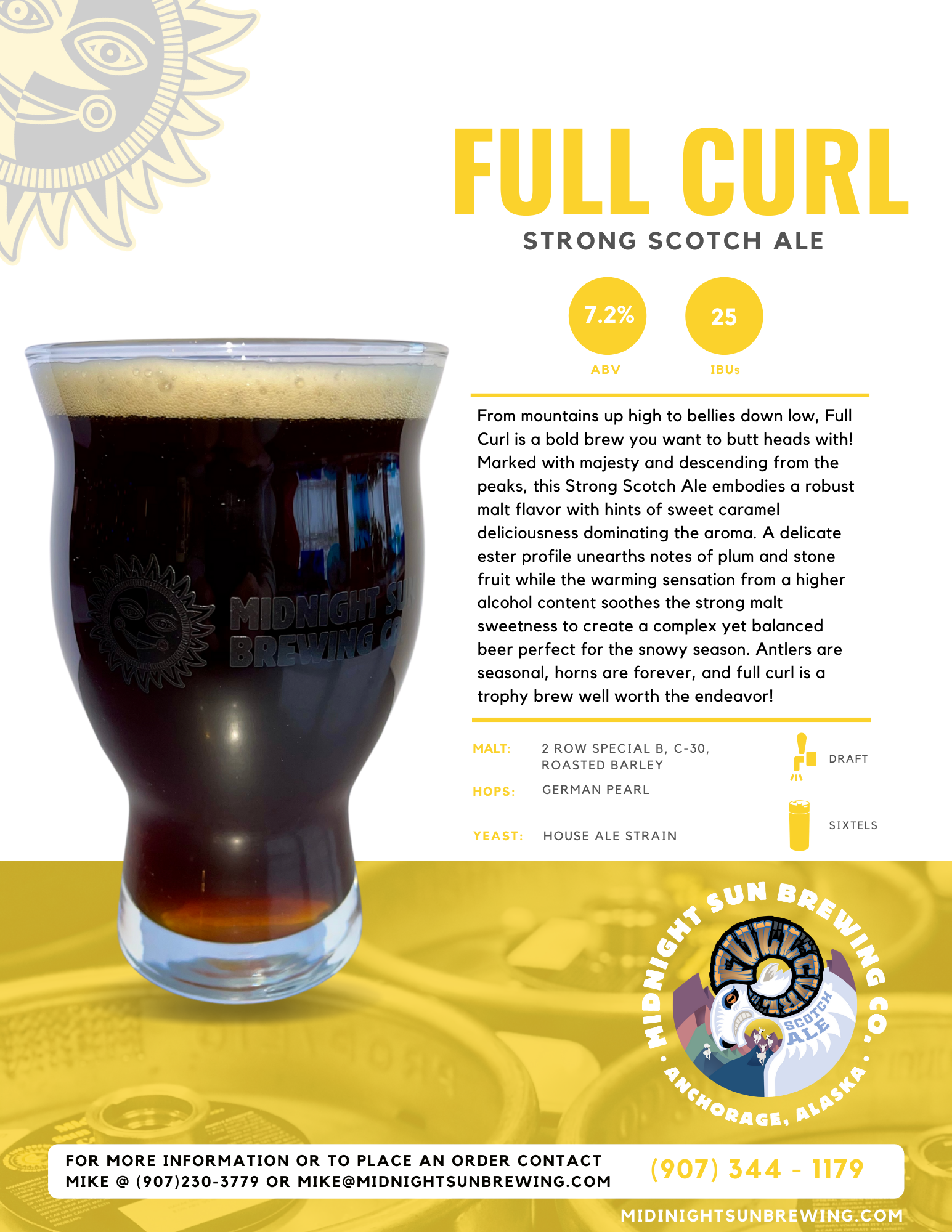 From mountains up high to bellies down low, Full Curl is a bold brew you want to butt heads with! Marked with majesty and descending from the peaks, this Strong Scotch Ale embodies a robust malt flavor with hints of sweet caramel deliciousness dominating the aroma. A delicate ester profile unearths notes of plum and stone fruit while the warming sensation from a higher alcohol content soothes the strong malt sweetness to create a complex yet balanced beer perfect for the snowy season. Antlers are seasonal, horns are forever, and full curl is a trophy brew well worth the endeavor!