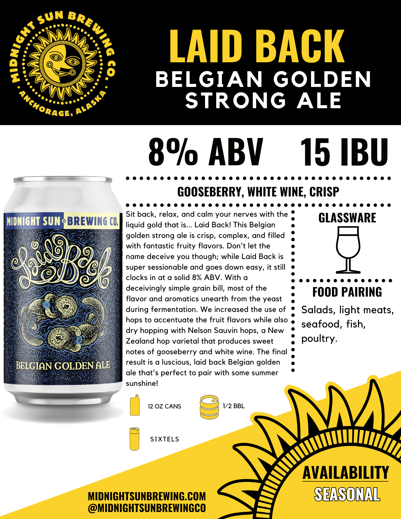 Sit back, relax, and calm your nerves with our newest release, Laid Back Belgian Golden Ale! Dry hopped with Nelson Sauvin hops to add sweet notes of gooseberry and white wine, Laid Back has a dry Belgian yeast character with fruity aromatics on the nose. A perfect pair with the warmer weather and summer sunshine to come!