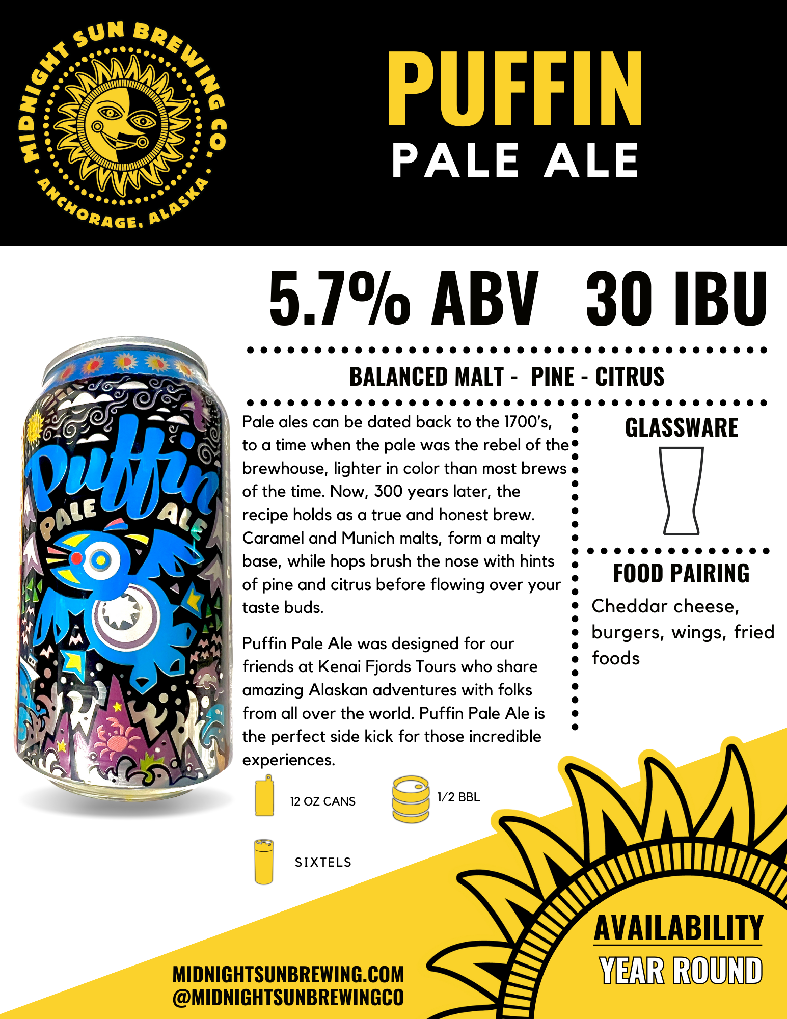 Puffin Pale Ale was designed for our friends at Kenai Fjords Tours who share amazing Alaskan adventures with folks from all over the world. Puffin Pale Ale is the perfect side kick for those incredible experiences.