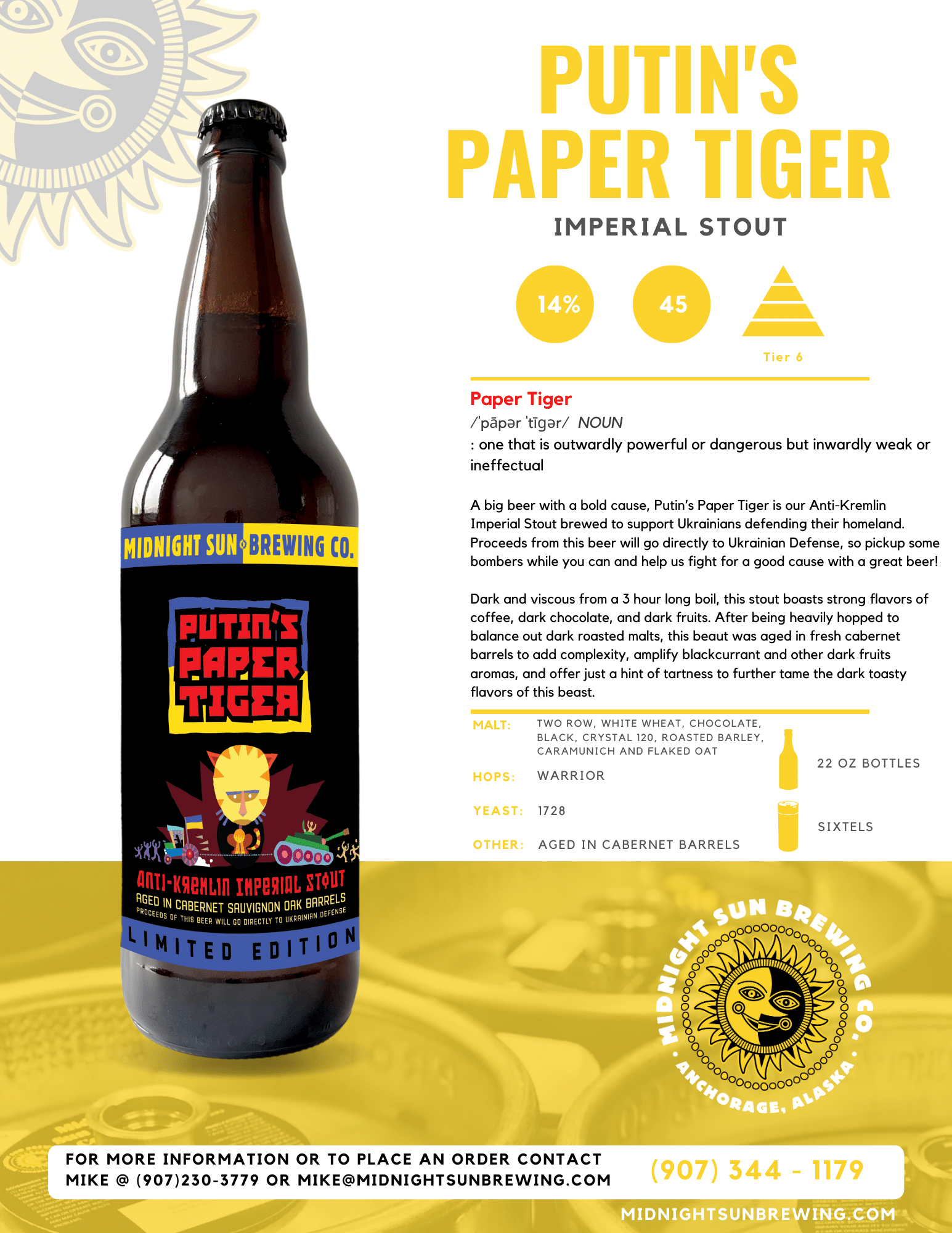A big beer with a bold cause, Putin’s Paper Tiger is our Anti-Kremlin Imperial Stout brewed to support Ukrainians defending their homeland.