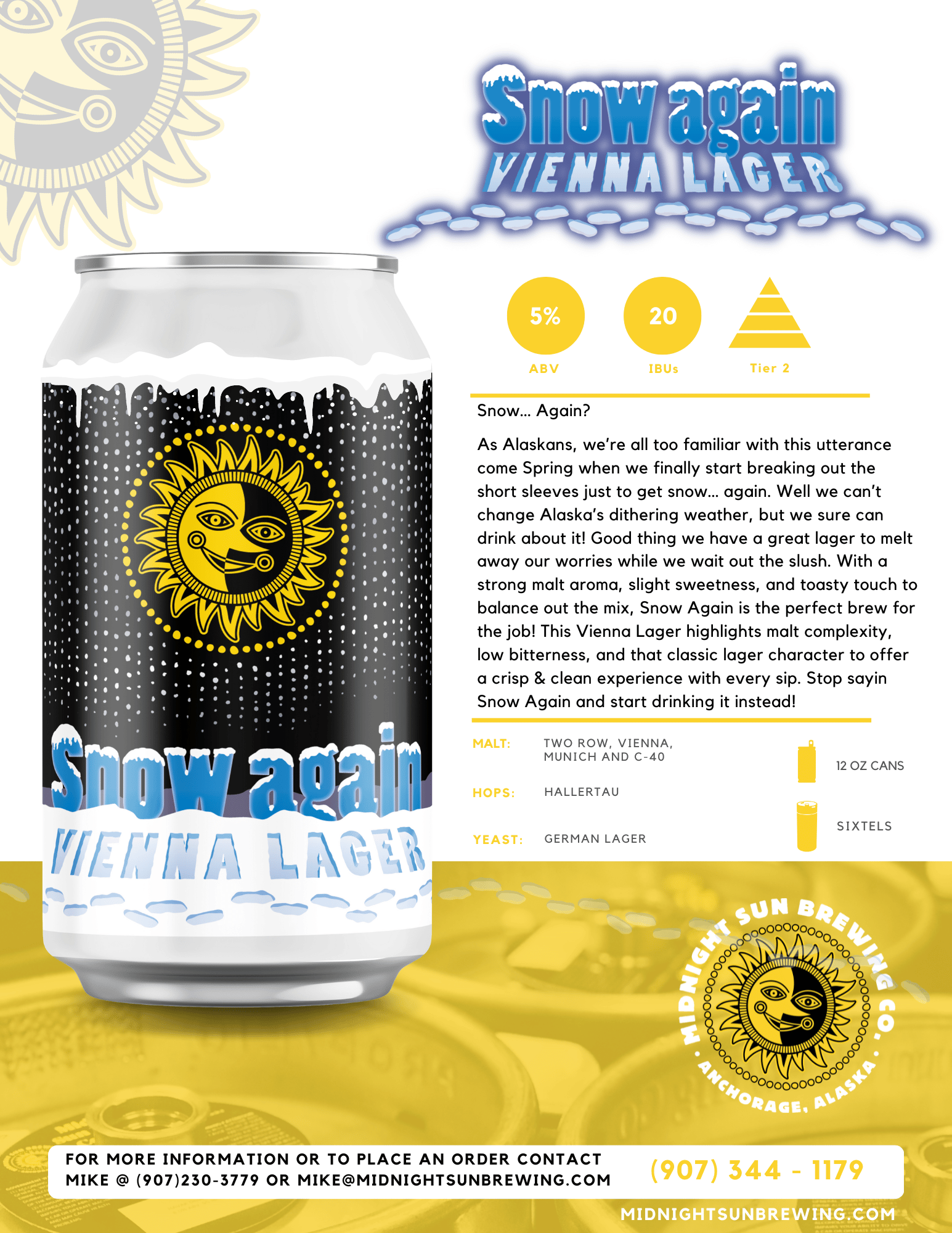 As Alaskans, we’re all too familiar with this utterance come Spring when we finally start breaking out the short sleeves just to get snow… again. Well we can’t change Alaska’s dithering weather, but we sure can drink about it! Good thing we have a great lager to melt away our worries while we wait out the slush. With a strong malt aroma, slight sweetness, and toasty touch to balance out the mix, Snow Again is the perfect brew for the job! This Vienna Lager highlights malt complexity, low bitterness, and that classic lager character to offer a crisp & clean experience with every sip. Stop saying Snow Again and start drinking it instead!