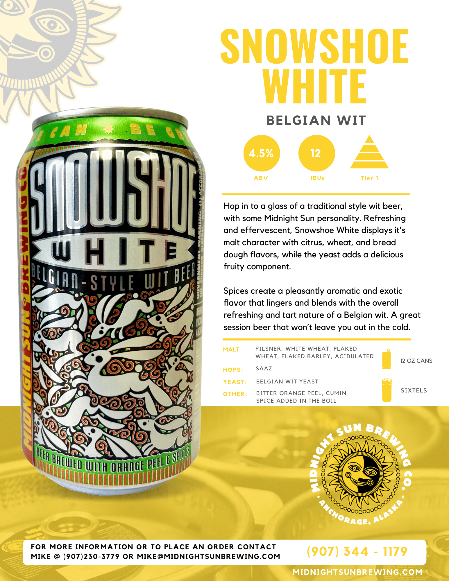 Hop in to a glass of a traditional style wit beer, with some Midnight Sun personality. Refreshing and effervescent, Snowshoe White displays it’s malt character with citrus, wheat, and bread dough flavors, while the yeast adds a delicious fruity component.