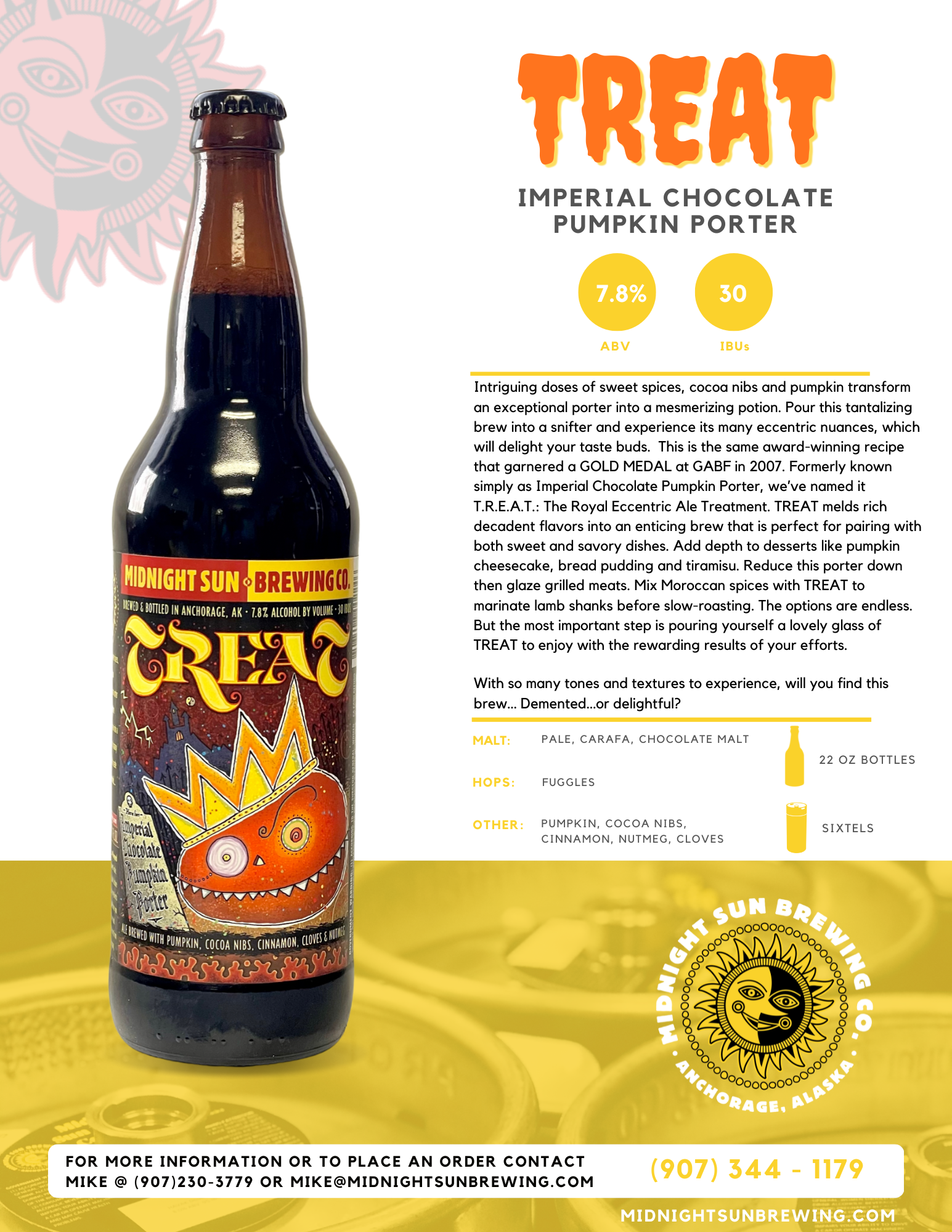 Intriguing doses of sweet spices, cocoa nibs and pumpkin transform an exceptional porter into a mesmerizing potion. Pour this tantalizing brew into a snifter and experience its many eccentric nuances, which will delight your taste buds. This is the same award-winning recipe that garnered a GOLD MEDAL at GABF in 2007. Formerly known simply as Imperial Chocolate Pumpkin Porter, we’ve named it T.R.E.A.T.: The Royal Eccentric Ale Treatment. TREAT melds rich decadent flavors into an enticing brew that is perfect for pairing with both sweet and savory dishes. Add depth to desserts like pumpkin cheesecake, bread pudding and tiramisu. Reduce this porter down then glaze grilled meats. Mix Moroccan spices with TREAT to marinate lamb shanks before slow-roasting. The options are endless. But the most important step is pouring yourself a lovely glass of TREAT to enjoy with the rewarding results of your efforts.