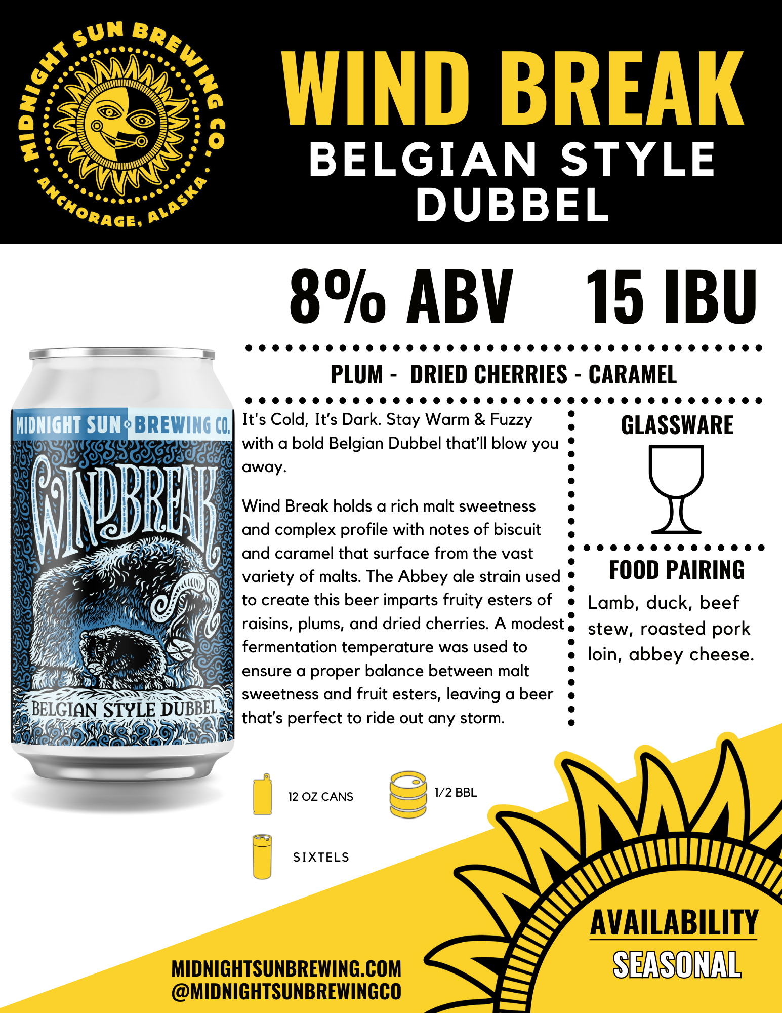 Wind Break holds a rich malt sweetness and complex profile with notes of biscuit and caramel that surface from the vast variety of malts. The Abbey ale strain used to create this beer imparts fruity esters of raisins, plums, and dried cherries which complement the complexity of this masterful mix. A modest fermentation temperature was used to ensure a proper balance between malt sweetness and fruit esters, leaving behind a malty, fruity, and light-bodied brew that’s perfect to ride out any storm.